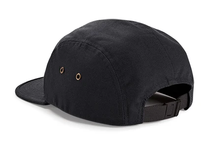 TearAway label for ease of rebranding, 5 panel design, flat peak, metal ventilation eyelets, snap fastening strap adjuster