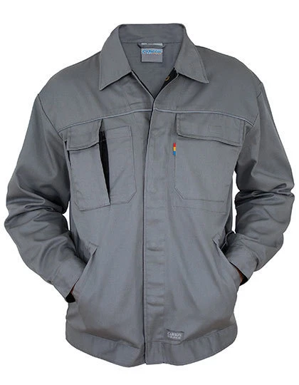 300 gsm • 65 % combed cotton, 35 % polyester • robust • concealed press studs • reflecting piping on chest and back • contrast colour golf pleat for greater freedom of movement (large space for decoration) •various concealed pockets • inside pockets with hook-and-loop fastener • sleeve ends with hook-and-loop fastener • washable up to 60°C.