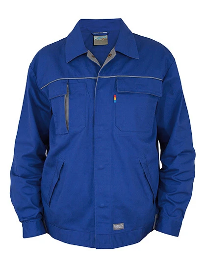 300 gsm • 65 % combed cotton, 35 % polyester • robust • concealed press studs • reflecting piping on chest and back • contrast colour golf pleat for greater freedom of movement (large space for decoration) •various concealed pockets • inside pockets with hook-and-loop fastener • sleeve ends with hook-and-loop fastener • washable up to 60°C.