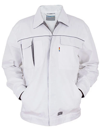 300 gsm • 65 % combed cotton, 35 % polyester • robust • concealed press studs • reflecting piping on chest and back • contrast colour golf pleat for greater freedom of movement (large space for decoration) •various concealed pockets • inside pockets with hook-and-loop fastener • sleeve ends with hook-and-loop fastener • washable up to 60°C.
