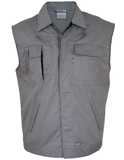 65 % combed cotton, 35 % polyester • concealed • robust press stud placket • reflecting piping on chest and back • contrast colour golf pleat for greater freedom of movement (large space for decoration) • chest pockets with hook-and-loop fastener • concealed side pockets • inside pocket with hook-and-loop fastener • washable up to 60°C.