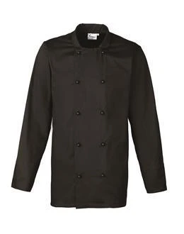 A chef's jacket that features Black plastic stud buttons that can be removed and replaced with other colours (PR652) so the culinary team can reflect the front-ofhouse branding. Designed with a Mandarin collar with top-stitching and turn-back spilt cuffs.