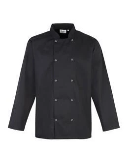 An easy-wearing long sleeve chef jacket with ten metal press studs in a popular wrap over style. Features a Mandarin collar with top-stitching and is available in Black or White.