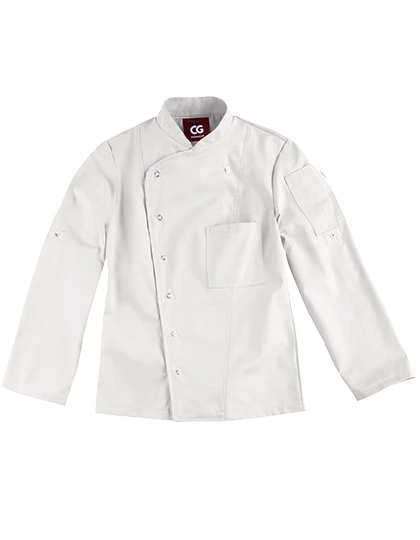 Trendy chef’s jacket, for ladies gently tailored, with practical press buttons, breast pocket and sleeve pocket. The sleeves can be rolled up and secured with a loop and a press button. Vent in the back for mobility. 95° C washable, crease-resistant, easy-care, colourfast, industrial laundering, finishing allowed.
