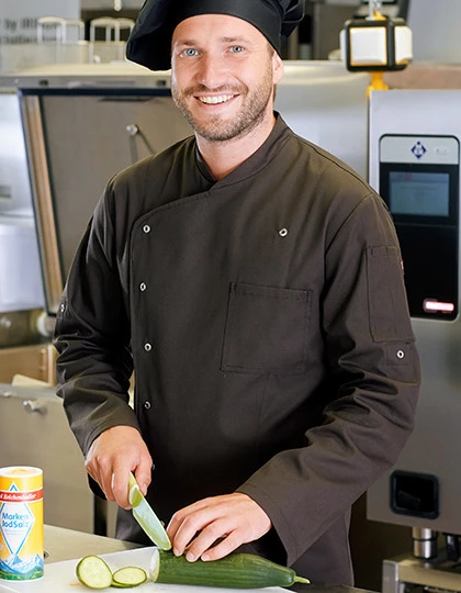 Trendy chef’s jacket with practical press buttons, breast pocket and sleeve pocket. The sleeves can be rolled up and secured with a loop and a press button. Vent in the back for mobility. 95° C washable, crease-resistant, easy-care, colourfast, industrial laundering, finishing allowed.