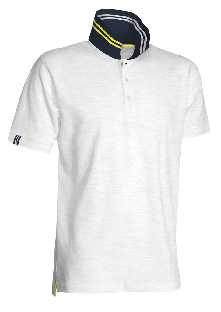 Children’s short-sleeved polo shirt with 3, matching, mother-of-pearl effect buttons, rib collar and sleeve edging, side vents, concealed collar stitching with contrasting tape, stretch seams, side reinforcement tape, inner neck tape