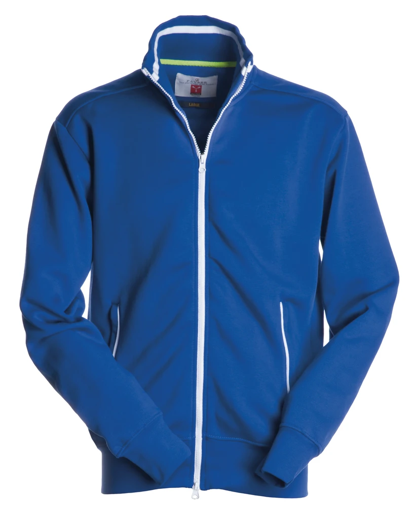 Children’s sweatshirt with full, contrasting coloured plastic SBS zip with double metal pull; rib collar with contrasting trim, side pockets with contrasting trim, fitted sleeves, two outer pockets with contrasting zip, stretch rib cuffs and hem, reinforced seams