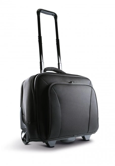 Computer case Trolley in 1000D PU backing and EVA, rigid structure, ultra light trolley system, front organized pocket, main compartment with inner computer padded holder fit for 15" laptop, document holder, stabilizer feet and bottom handle, trolley belt on the back. SBS zips.