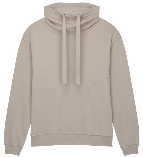 Crafted from substantial 300 gsm organic cotton, the fabric is finished with a soft sueded surface for an enhanced premium feel. The distinctive funnel neckline provides added warmth while maintaining a structured, fashion-led appearance.