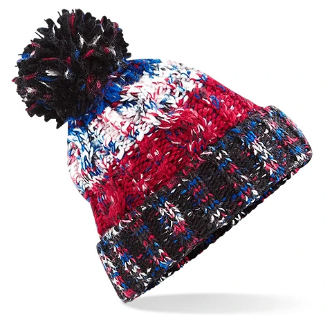 TearAway label for ease of rebranding, Cuffed design for optimal decoration, Heavyweight multi yarn cable knit design, Luxurious shearling thermal band for extra warmth, Luxury pom pom, Bold four colour stripe design