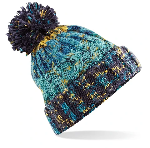 TearAway label for ease of rebranding, Cuffed design for optimal decoration, Heavyweight multi yarn cable knit design, Luxurious shearling thermal band for extra warmth, Luxury pom pom, Bold four colour stripe design