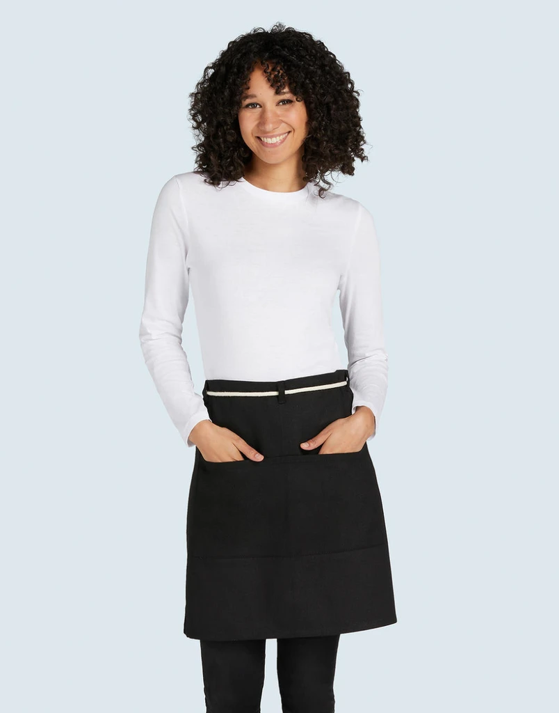 This is a bistro apron with a difference, on trend and practical too. Made of canvas and featuring natural cord tie through fabric loops at the waist and a large 2 compartments pocket, it is designed to make teams look Fashionable and Professional. The colours are "on-trend" too : choose from our stand-out shades designed for their Uniqueness. Washable at 60°, it's also colourfast and easy care, for a long-lasting fresh look.