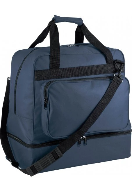 Team sports bag in polyester 600D, double rubber feeling PVC backing, 60 litres. Detachable rigid bottom in PP plastic, with plastic feet. Zipped front pocket ideal for personalization, card holder, detachable shoulder belt with silicon pad. The rigid bottom comes with the bag.