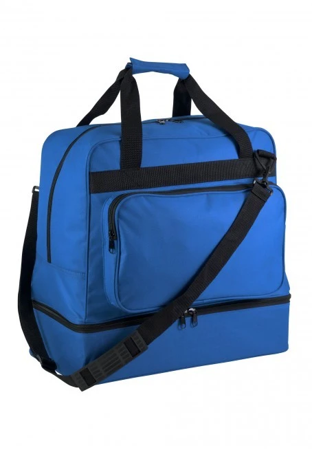 Team sports bag in polyester 600D, double rubber feeling PVC backing, 60 litres. Detachable rigid bottom in PP plastic, with plastic feet. Zipped front pocket ideal for personalization, card holder, detachable shoulder belt with silicon pad. The rigid bottom comes with the bag.