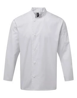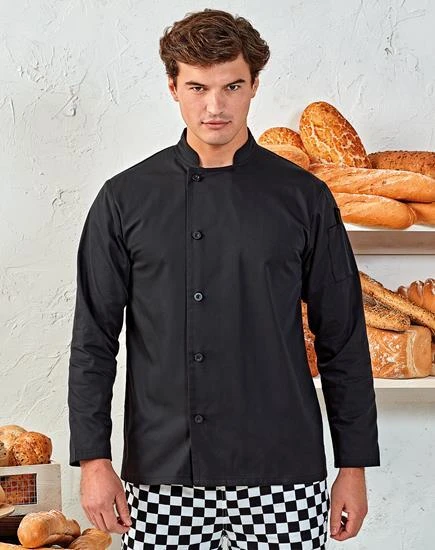 A durable long sleeve chef's jacket that fastens down the right hand side of the body with five long life resin buttons. On the upper left sleeve there is a handy double pocket pen compartment. This jacket is styled with a mandarin collar and is available in Black and White and offers great value for money.