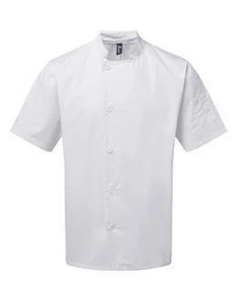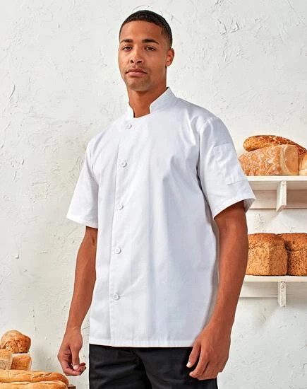 A durable short sleeve chef's jacket that fastens down the right hand side of the body with five long life resin buttons. On the upper left sleeve there is a handy double pocket pen compartment. This jacket is styled with a mandarin collar and is available in Black and White and offers great value for money.