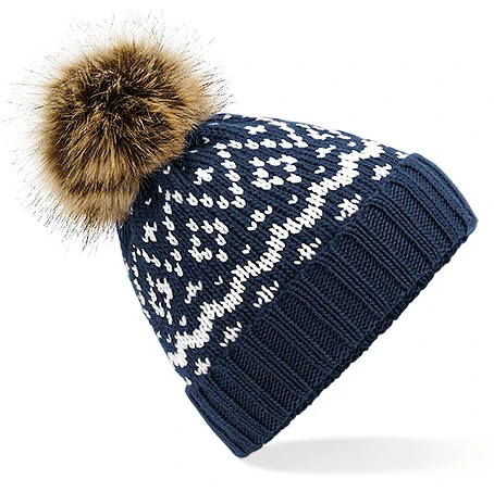 TearAway label for ease of rebranding, timeless Fair Isle pattern, removable luxury faux fur pom pom, compatible with interchangeable Pop Pom products, cuffed design for optimal decoration