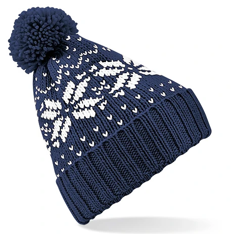TearAway label for ease of rebranding, classic styling, self-coloured pom pom, cuffed design for optimal decoration, timeless Fair Isle pattern