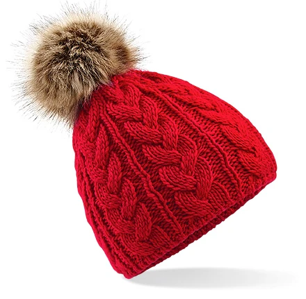 TearAway label for ease of rebranding, pull-on style, unisex styling, sumptuous heavy cable knit, hand-knitted feel, Suprafleece® thermal band, luxury removable faux fur pom pom for ease of washing