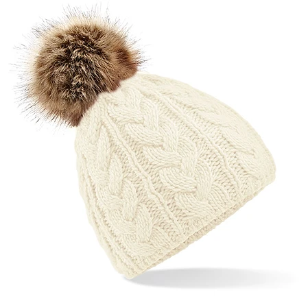 TearAway label for ease of rebranding, pull-on style, unisex styling, sumptuous heavy cable knit, hand-knitted feel, Suprafleece® thermal band, luxury removable faux fur pom pom for ease of washing