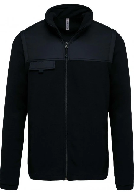 Outer: fleece 100 % polyester 400 g/m². Backing 100 % polyester taslon with acrylic coating. Polyester inner sleeve lining 210T. 2 in 1 fleece jacket 2 zipped front pockets and 1 chest pocket with flap and tear release fastening. Tone on tone yokes on front, back and lower arms. Easy decoration access front and back. Polyester lined removable sleeves for added comfort. Elasticated cuffs and hem.