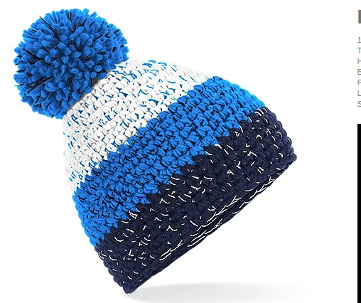 TearAway label for ease of rebranding, Hand-knitted, bold three colour stripe design, pull-on style, luxury pom pom, Suprafleece® thermal band