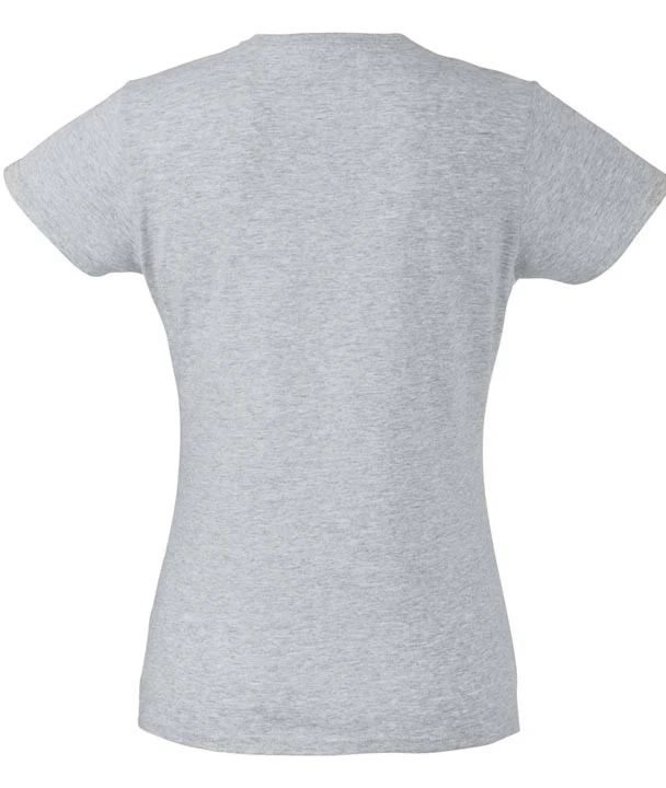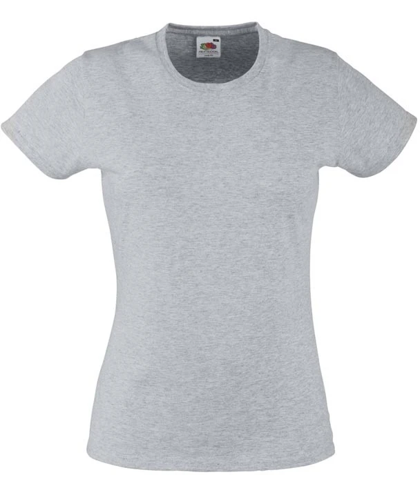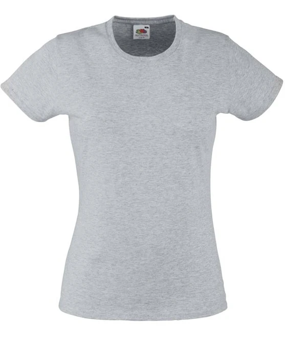 Material: 100% cotton; Heather Grey: 97% cotton, 3% polyester; HD, R6, RX, VF, VH, HP, H1: 50% cotton, 50% polyester; Weight: 165gsm (white: 160gsm); Crew neck with cotton/LYCRA® rib, self-fabric back neck tape, shaped side seams for a feminine fit, fine knit gauge for enhanced printability, tear away label, feminine Fashion Fit cut; Certificates: STANDARD 100 by OEKO-TEX®; WRAP