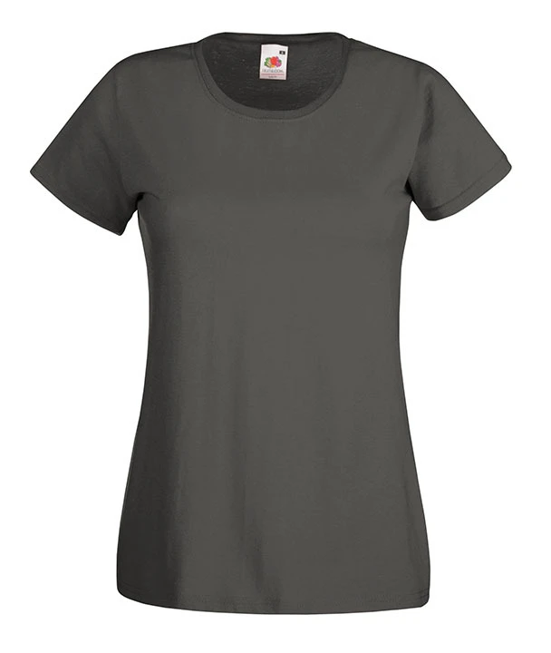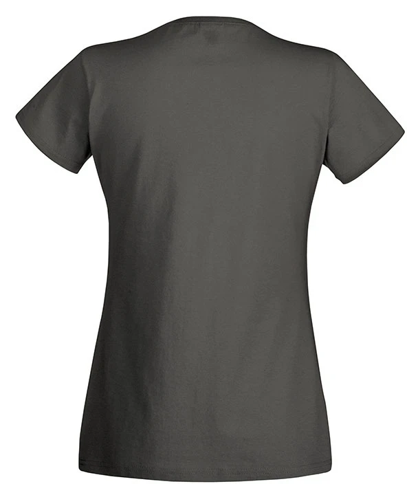 Material: 100% cotton; Heather Grey: 97% cotton, 3% polyester; HD, R6, RX, VF, VH, HP, H1: 50% cotton, 50% polyester; Weight: 165gsm (white: 160gsm); Crew neck with cotton/LYCRA® rib, self-fabric back neck tape, shaped side seams for a feminine fit, fine knit gauge for enhanced printability, tear away label, feminine Fashion Fit cut; Certificates: STANDARD 100 by OEKO-TEX®; WRAP