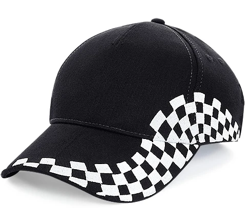 5 panel design, pre-curved peak, stitched ventilation eyelets, perfect for print and embroidery, pre-embroidered chequer design