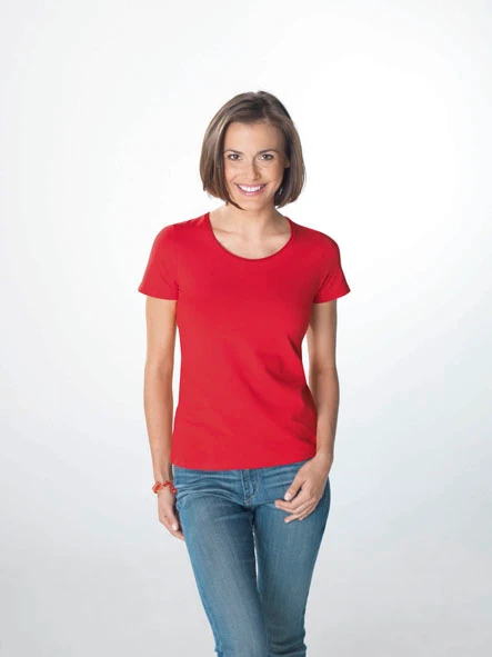 200 gsm • 95 % ringspun combed cotton, 5 % elastane • short sleeve shirt with silky surface • wide round neck • neckband • no label • logo print in neck • feminine • rolled collar • side seams • double seams on sleeve end and bottom hem.