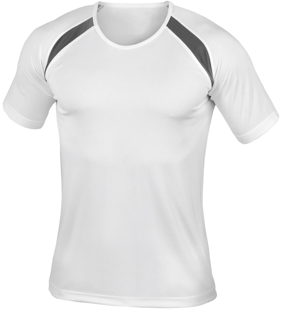 145 gsm • 100 % polyester • breathable function shirt • no textile label • stamped product information • crew neckline with double-needle stitching • raglan sleeves with grey contrast stripes on front and back • double-needle stitching on sleeve and bottom hem • side seams.