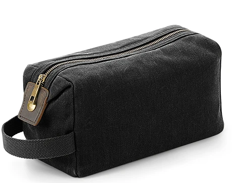 TearAway label for ease of rebranding, genuine leather accents, extra long main compartment zip for easy access, fully lined, zippered internal pocket, internal organisation pockets, cotton webbing grab handle, antique brass effect fittings; Dimensions: 25 x 13 x 11 cm; Capacity: 4 litres