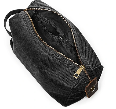 TearAway label for ease of rebranding, genuine leather accents, extra long main compartment zip for easy access, fully lined, zippered internal pocket, internal organisation pockets, cotton webbing grab handle, antique brass effect fittings; Dimensions: 25 x 13 x 11 cm; Capacity: 4 litres