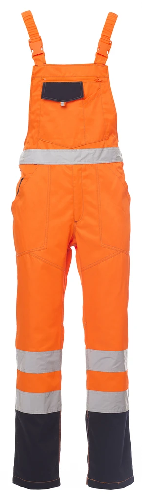 High visibility bib with reflective stripes and extensive renal protection, elastic braces and buckle with snap closure, side opening with buttons, elastic waist at the back. Triple seams on the crotch and inside leg. Double chest pocket, one with zip and hook ring for ID holders, one with flap and a pen pocket. Two large front pockets, one with a coin pocket, one closed back pocket with flap and one right side tape measure pocket