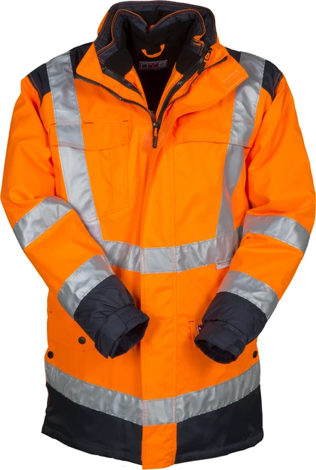 Men’s two-tone, all-purpose, high-visibility parka with 3M stripes. Outer unpadded jacket with plastic zip with metal pull with flap and Velcro, foldaway and/or detachable hood with drawstring, elasticated adjustable cuffs, four roomy front pockets, two with zip, one breast pocket with pen holder and foldaway badge holder and one pocket with concealed zip. Fleece inside collar, zip for easier printing and embroidery. Lightweight jacket with detachable sleeves, padded, plastic zip with metal pull, elasticated cuffs, three front pockets with flap and Velcro, detachable, foldaway badge holder, one pocket with concealed zip, micro-fleece inside collar and shoulders, inner zip for easier printing and embroidery, heat taped seams