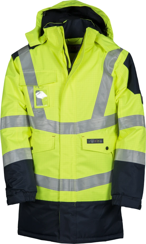 Two-tone, high-visibility all-purpose parka, with 8 mm plastic zip and metal cursor with Velcro flap, detachable, fitted, ergonomic hood with drawstring, stretch adjustable cuffs, roomy front pockets with flap and button, two with zip, foldaway/detachable badge holder, padded
