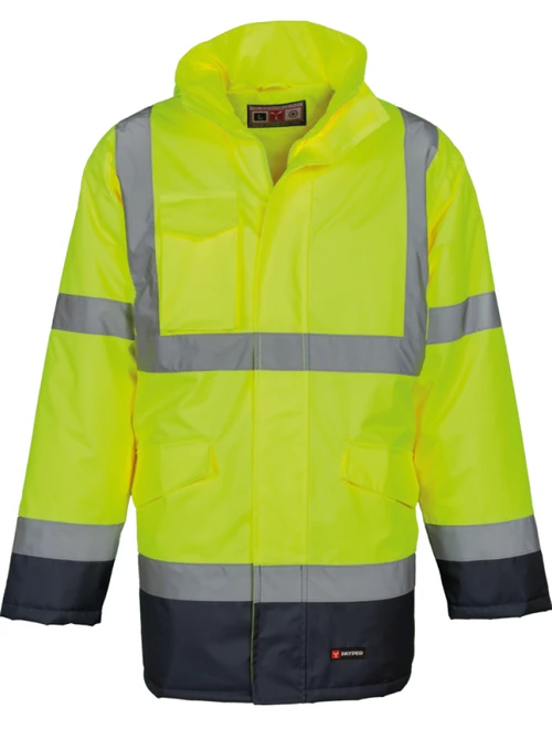 Two-tone high visibility parka with reflective bands, full zip with flap, hood that can be folded into the collar, elasticated RIB cuffs, two front pockets with flap, smartphone pocket and a hook ring for ID holders. Padded inner layer, internal pocket with Velcro, heat-sealed seams