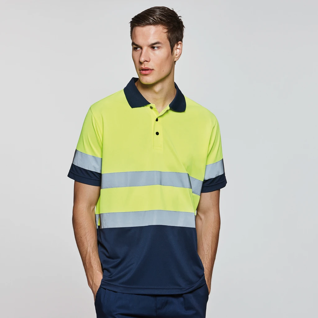 High visibility short sleeve polo shirt with three buttons placket, two reflective bands in body and one on sleeves.