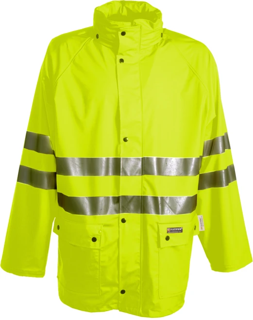 High-visibility, rain jacket with 3M stripes, raglan sleeves, full nylon zip and flap with snap fasteners, foldaway hood, drawstring waist, straight sleeves with elasticated inside cuff, two pockets with flap. Heat taped stripes and seams