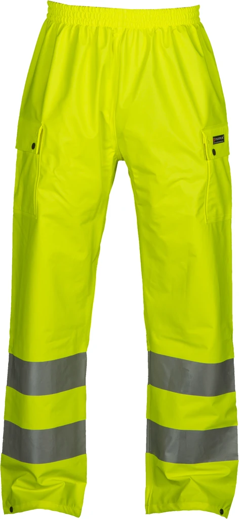 High-visibility rain trousers with 3M stripes, elasticated waist, two side pockets with flap and buttons, adjustable leg bottom with snap fastener, heat taped seams