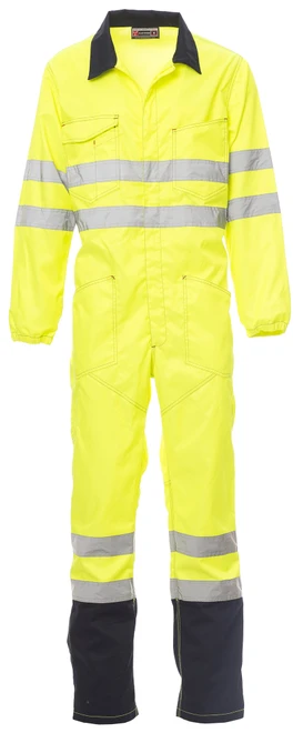 High visibility tracksuit with reflective stripes, central zip with double metal pull, elastic at the back of the waist. Triple seams on the crotch and inside leg. Two large patch pockets, two chest pockets, one with flap and hook ring for ID holders, one pen pocket, one back pocket with flap, one side tape measure pocket on the right, cuffs with elastic bands