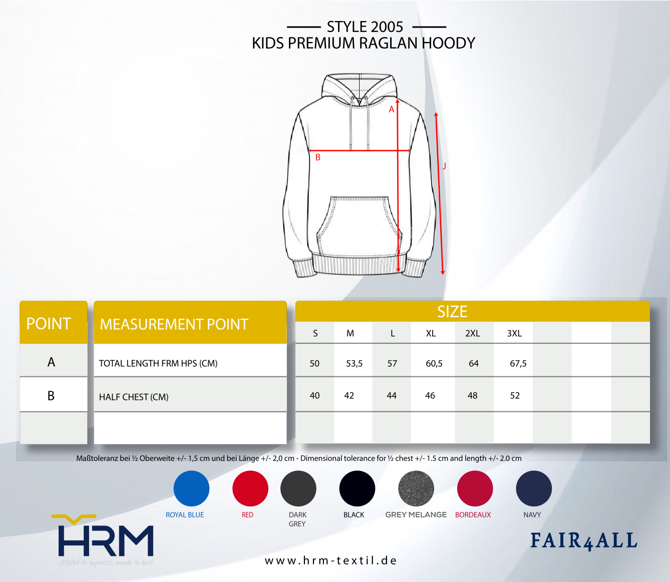 HRM KID'S PREMIUM RAGLAN HOODIES & HOODED JACKETS are made from 70% high quality combed ring-spun cotton and 30% recycled polyester. The wearing comfort is particularly characterized by the excellent workmanship, the soft, supple materials and the child-friendly, modern-classic fit. Two side pockets with zippers and two inside pockets offer storage space and underline its suitability for everyday use. The hood drawstring, with wide tone-on-tone cords and three metal eyelets in an antique look, is aesthetically pleasing. Thanks to the fine surface structure, they are ideal for textile finishing.