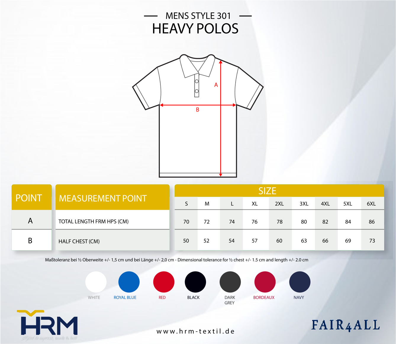 Our HRM Men‘s Heavy Polo Shirts are made from especially robust ring-spun piqué made of 100% cotton. They have a pleasing fashionable cut and a reinforced neckband as well as collar and sleeve ends made from 1x1 rib knit. The tone-in-tone 3-button placket gives the heavy polo shirts a well-balanced look down to the detail. The reinforced side slits and the shoulder-toshoulder neckband ensure a great wear comfort and long durability. The heavy polo shirts are, apart from the woven Fair4All flag-label in the left side seam, label-free and by the anti-shrink and anti-pilling treatment can be washed up to 60°C and is particularly easy to clean even with high and regular wash cycles. They are particularly suitable for extreme indoor and outdoor workwear use.