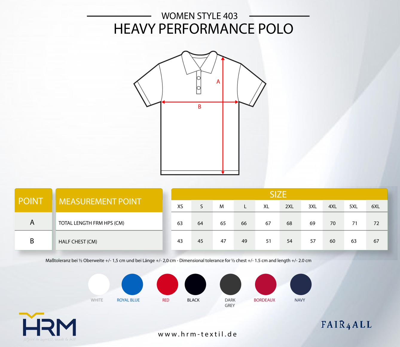 Our HRM Women‘s Heavy Performance polo shirts are made of a particularly robust, ring-spun, fine-mesh piqué made of 65% cotton 35% polyester. They have a form-fit fashionable cut and a reinforced neckband as well as collar and sleeve ends made from 1x1 rib knit. The tone-in-tone 3-button placket with HRM details gives the Heavy Performance polo shirts a fine look in every detail. The reinforced side slits and the shoulderto- shoulder neckband ensure a great wearing comfort and a long durability. The performance polo shirts are, apart from the woven Fair4All flag-label in the left side seam, label-free. They can be washed up to 60°C by the anti-shrink and anti-pilling pre-treatment and are particularly easy to clean even at high and regular washing cycles. The polyester share in the material increases the wear comfort and ensures the perfect fit. They are particularly suitable for a wide range of workwear applications.