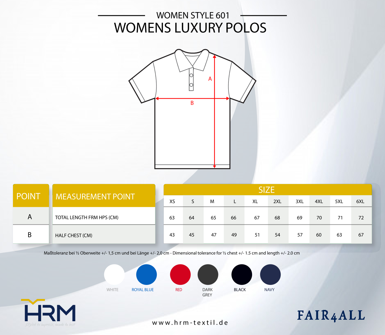 Our HRM Women‘s Luxury Polo Shirts with the innovative collar processing are made of ring-spun, fine-meshed piqué from 100% cotton and have a fashionable, figure-fit cut with a tone-in-tone 3-button placket with HRM details. Twill-band reinforced side slits and the twill neckband ensure a great wear comfort and a long durability. They are washable up to 60°C and by the anti-shrink and anti-pilling pre-treatment are particularly easy to clean even with high and regular washing cycles. Our luxury cotton polo shirts are label-free, except for the woven Fair4All flag-label in the left side seam.