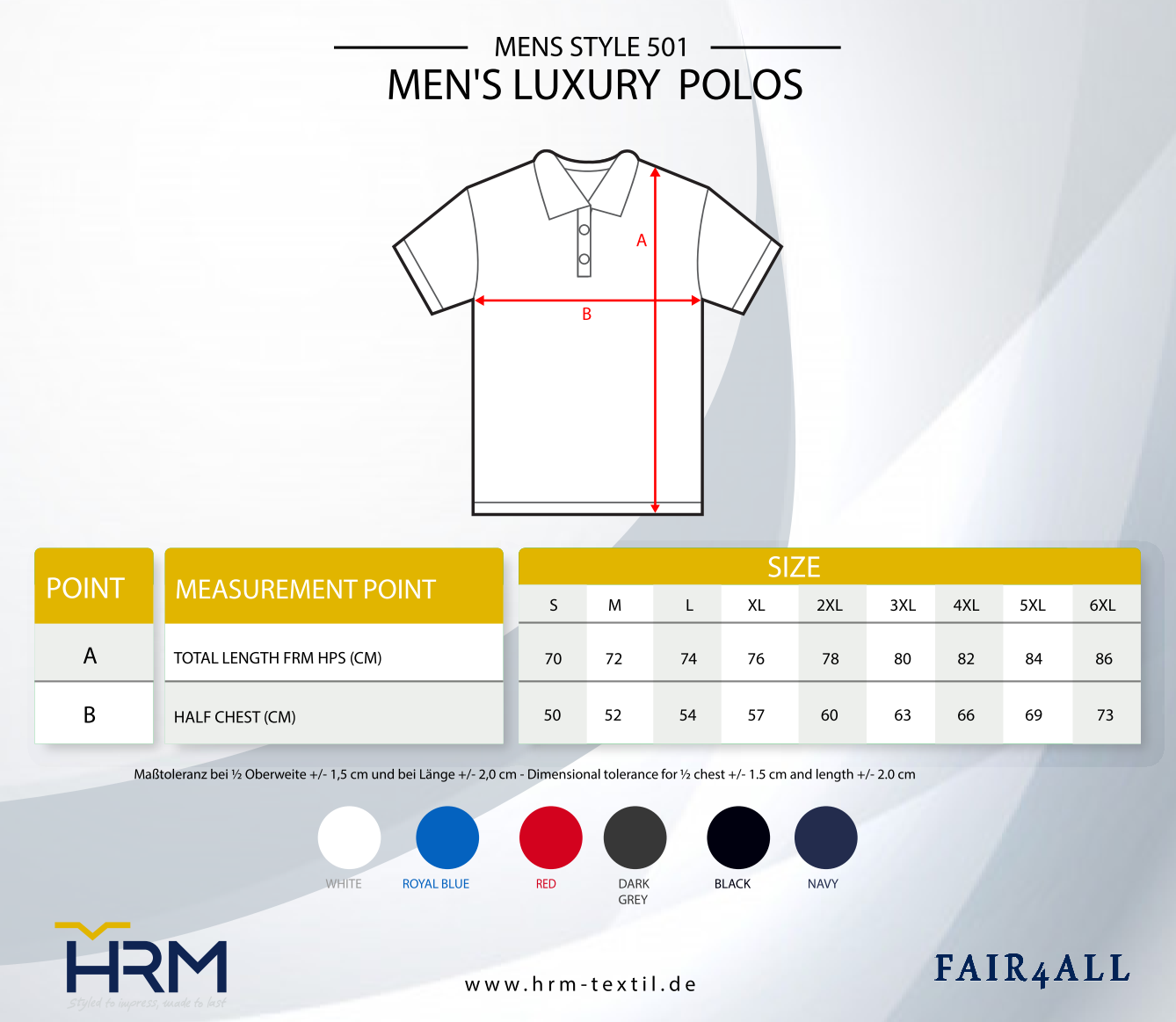 Our HRM Men‘s Luxury Polo Shirts with the innovative collar processing are made of ring-spun, fine-meshed piqué from 100% cotton and have a fashionable, figure-fit cut with a tone-in-tone 3-button placket with HRM details. Twill-band reinforced side slits and the twill neckband ensure a great wear comfort and a long durability. They are washable up to 60°C and by the anti-shrink and anti-pilling pre-treatment are particularly easy to clean even with high and regular washing cycles. Our luxury cotton polo shirts are label-free, except for the woven Fair4All flag-label in the left side seam.