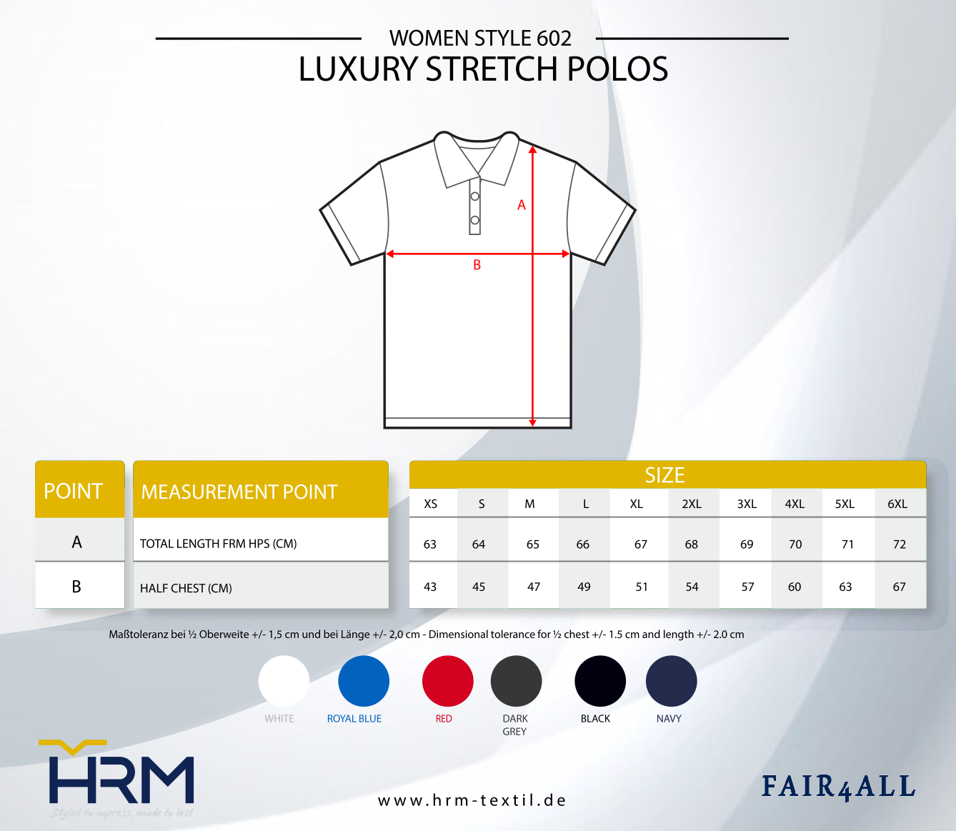 Our HRM Women‘s Luxury Stretch polo shirts with the innovative collar processing are made of 95% cotton and 5% elastane ring-spun piqué and have a fashionable, figure-fit cut with a tone-in-tone 3-button placket with HRM details. Twill-band reinforced side slits and the twill neckband ensure a great wearing comfort and a long durability. They are particularly easy to care due to the anti-shrink and anti-pilling treatment. The Luxury Stretch polo shirts, except for the woven Fair4All flag-label in the left side seam, are label-free. Due to their elastane content, they are very comfortable to wear, especially during office hours and/or leisure.