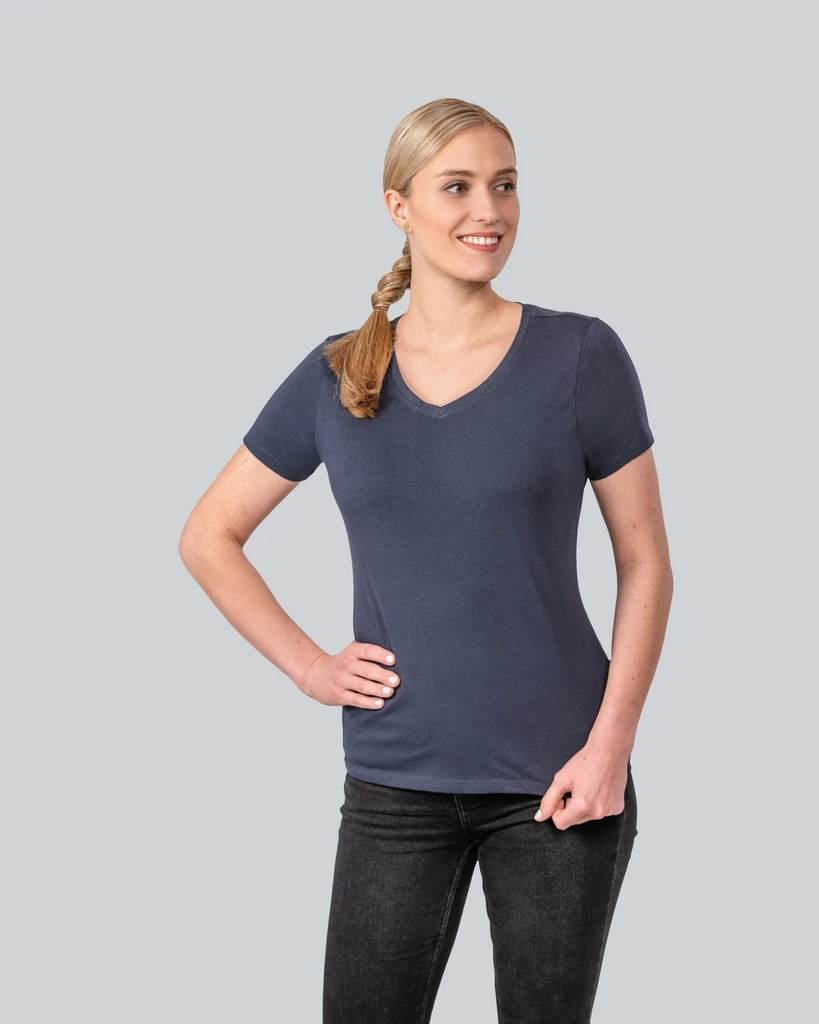 Our HRM V-neck Women‘s T-Shirts are extremely durable because they are made from high quality, combed and ring-spun, 100% organic, GOTS-certified cotton. The wearing comfort of our T-shirts is characterized by the soft and supple materials and the excellent fashionable fit. The double-stitched shoulder-to-shoulder neckband enhances the ergonomic feel and adds extra stability to the T-shirt. Our T-shirts are, except for the woven Fair4All flag-label in the left side seam, label-free and are colourfast washable up to 60° C. Our t-shirts have a very long life due to the anti-shrink and anti-pilling treatment. Thanks to their fine surface structure, they are particularly suitable for textile finishing.