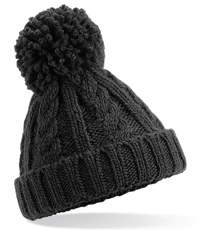 TearAway label for ease of rebranding, cuffed design for optimal decoration, heavyweight melange cable knit, hand-knitted feel, cotton Jersey lining for comfort and breathability, non-removable pom pom for added safety, self-coloured pom pom