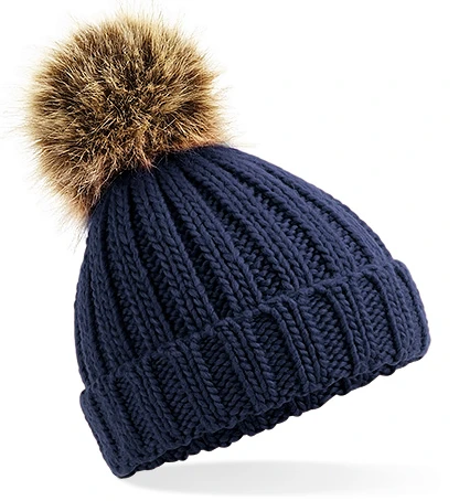 TearAway label for ease of rebranding, sumptuous heavy ribbed knit, luxury faux fur pom pom, non-removable pom pom for added safety, cuffed design for optimal decoration, unisex styling